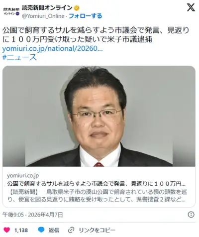 【猿】公園で飼育するサルを減らすよう市議会で発言、見返りに100万円受け取った疑いで米子市議逮捕 鳥取