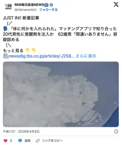 【福岡】「ちょっと体に何かを入れられた」マッチングアプリで知り合った20代男性に覚醒剤を注入か 62歳男「間違いありません」