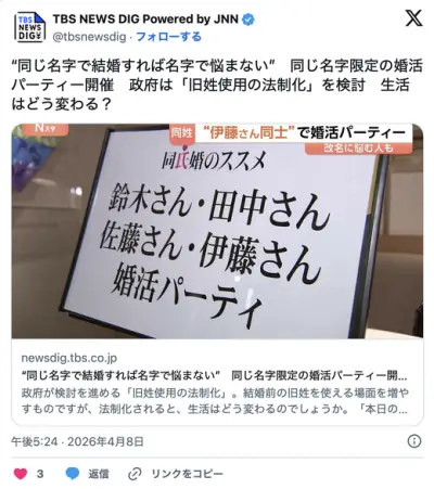 “同じ名字で結婚すれば名字で悩まない” 同じ名字限定の婚活パーティー開催 政府は「旧姓使用の法制化」を検討 生活はどう変わる?