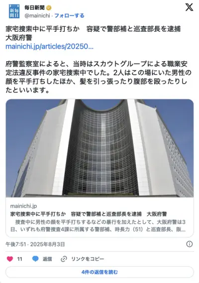 【大阪府警】家宅捜索中 その場にいた男性の顔を平手打ちか 容疑で警部補と巡査部長を逮捕