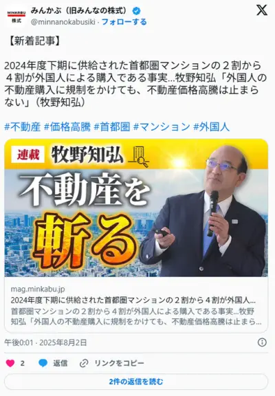 外国人がほぼ無制限で不動産を購入出来る世界で唯一の国ニッポン。首都圏物件の約4割を外国人が購入
