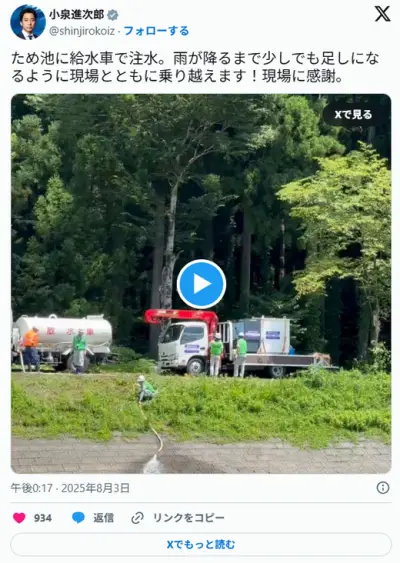 【動画】進次郎、ため池に給水車で注水wwwwwwwwwwwwww