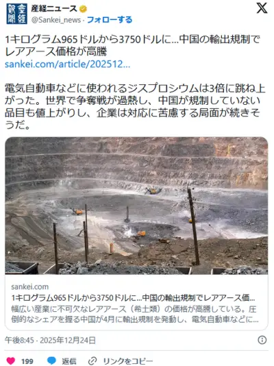 レアアース、1キログラム965ドル(約15万円)から3750ドル(約58万円)に 価格高騰