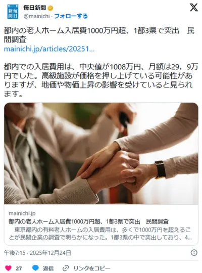 都内の老人ホーム入居費1000万円超、1都3県で突出 民間調査