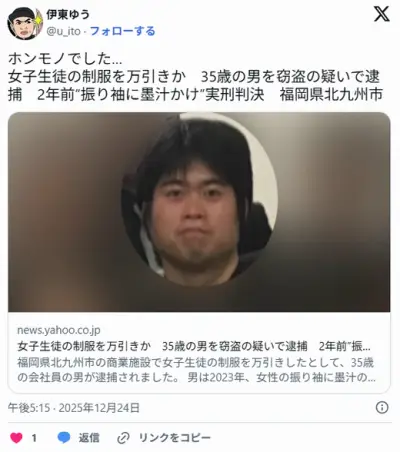 【福岡】女子生徒の制服を万引きか 35歳の男を窃盗の疑いで逮捕 2年前には”振り袖に墨汁かけ”実刑判決