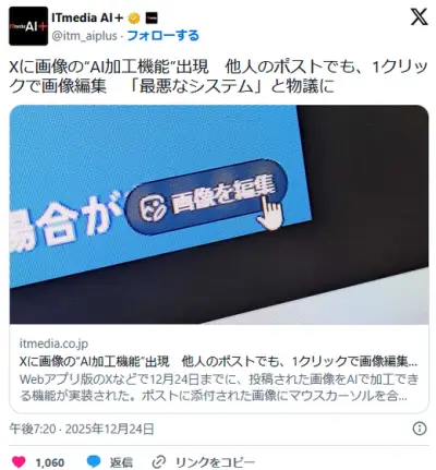 Xに画像の“AI加工機能”出現 他人のポストでも、1クリックで画像編集 「最悪なシステム」と物議に