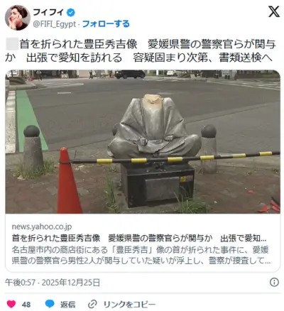 首を折られた豊臣秀吉像 愛媛県警の警察官らが関与か 出張で愛知を訪れる 容疑固まり次第、書類送検へ