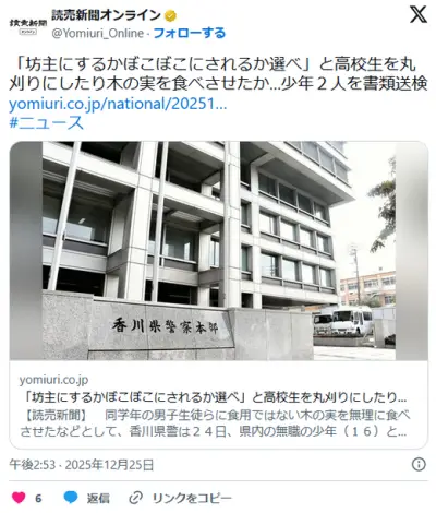 【香川】「坊主にするかぼこぼこにされるか選べ」と高校生を丸刈りにしたり食用ではない木の実を食べさせたか…少年2人を書類送検