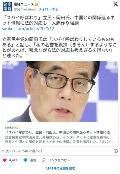 立憲・岡田克也、ネット民に警告「スパイ呼ばわりしているものもある」「法的対応も考えざるを得ない」