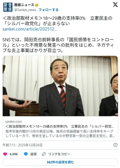 立憲民主党、18~29歳の支持率0% なぜ・・・
