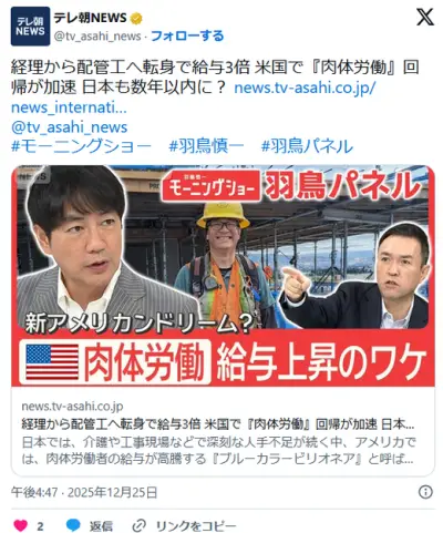 【ブルーカラー】経理から配管工へ転身で給与3倍 米国で『肉体労働』回帰が加速 日本も数年以内に?