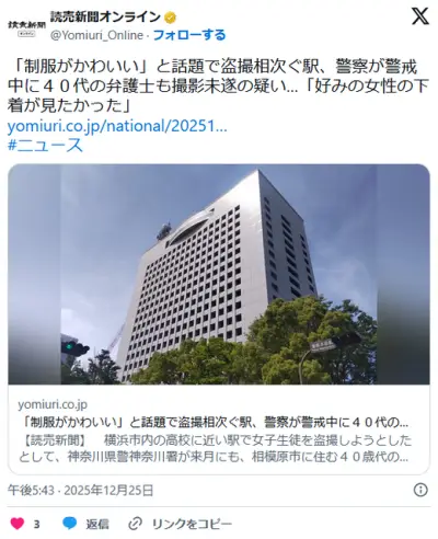 【布】「制服がかわいい」と話題で盗撮相次ぐ駅、警察が警戒中に40代の弁護士も撮影未遂の疑い…「好みの女性の下着が見たかった」