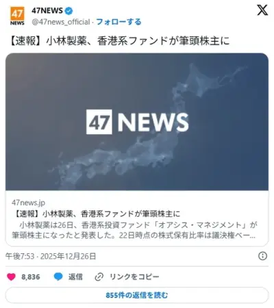 小林製薬、中国系ファンドが筆頭株主へ