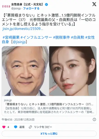 「悪質極まりない」1.5億円脱税インフルエンサー(37) 父・白眞勲氏は「一切のコメントを差し控えるよう指示を受けている」[12/26]