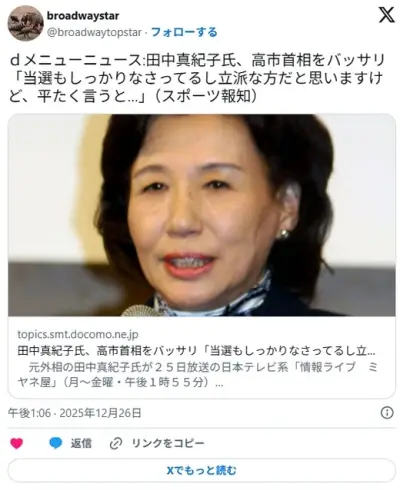 田中真紀子「高市首相はぼっち飯。こんな人が首相なのはねぇ…?