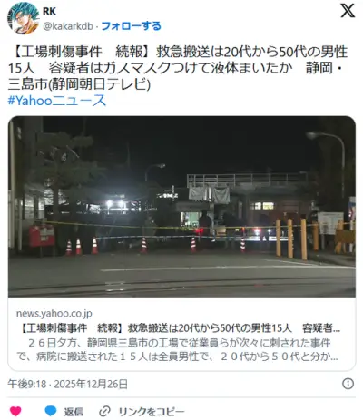【横浜ゴム工場刺傷事件 続報】救急搬送は20代から50代の男性15人 容疑者はガスマスクつけて液体まいたか 静岡・三島市