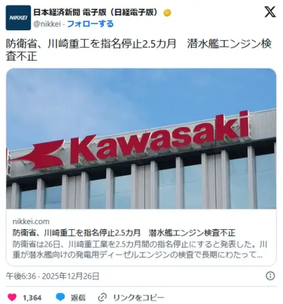 防衛省、川崎重工を指名停止2.5カ月 潜水艦エンジン検査不正