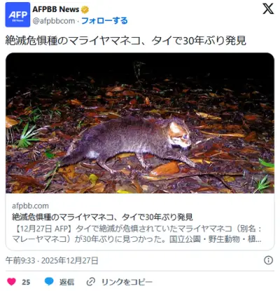 絶滅危惧種のマライヤマネコ、タイで30年ぶり発見