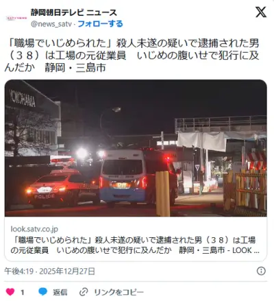 【横浜ゴム工場】「職場でいじめられた」殺人未遂の疑いで逮捕された男(38)は工場の元従業員 いじめの腹いせで犯行に… 静岡・三島