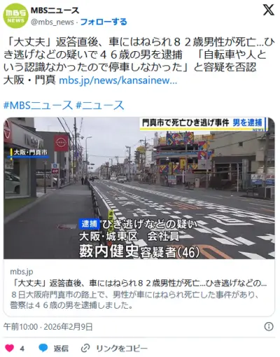 【大阪】車にはねられ82歳男性が死亡 46歳の男を逮捕「自転車や人という認識なかったので停車しなかった」と容疑否認