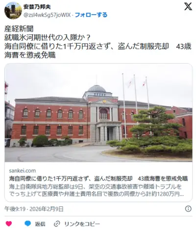 海自同僚に借りた1千万円返さず、盗んだ制服売却 43歳海曹を懲戒免職…呉地方総監部