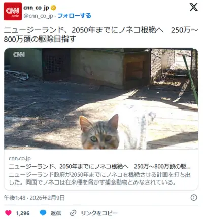 【国際/環境】ニュージーランド、2050年までにノネコ根絶へ 250万~800万頭の駆除目指す