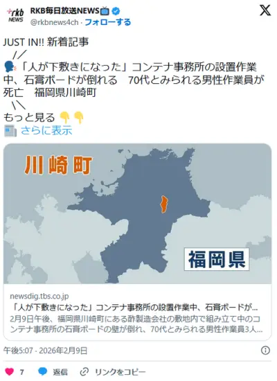 【福岡】「人が下敷きになった」コンテナ事務所の設置作業中、石膏ボードが倒れる 70代とみられる男性作業員が死亡 川崎町