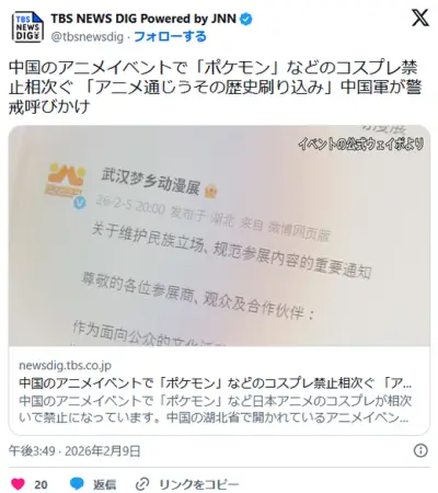 中国のアニメイベントで「ポケモン」などのコスプレ禁止相次ぐ 「アニメ通じうその歴史刷り込み」