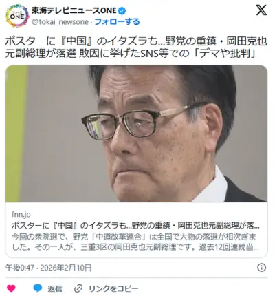 ポスターに『中国』のイタズラも…野党の重鎮・岡田克也元副総理「私が中国のスパイ?冗談じゃないよ!と思いますけども」