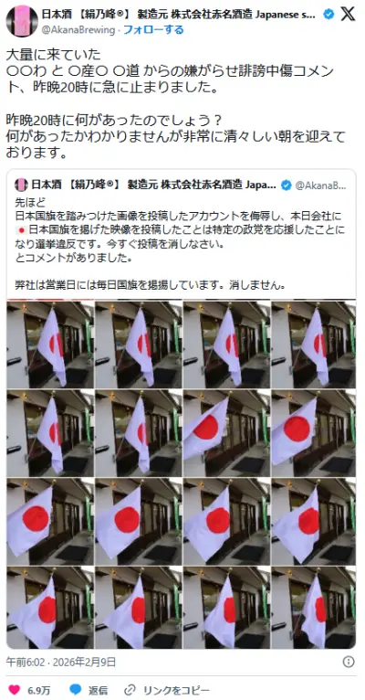 日の丸を掲げる酒造会社、大量の嫌がらせが殺到するも、2月8日の20時以降なぜか一切来なくなったと告白