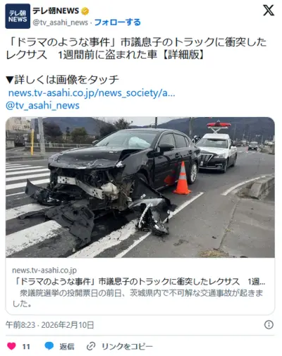 【茨城】「ドラマのような事件」つくば市議息子のトラックに衝突したレクサス 1週間前に盗まれた車
