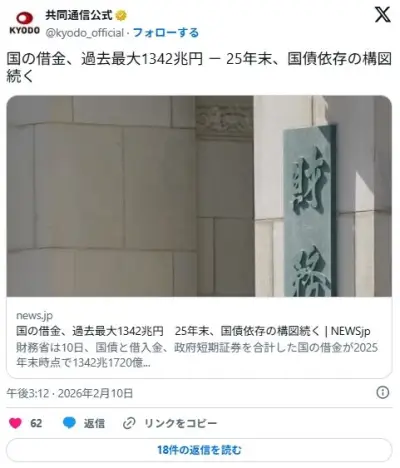 国の借金、過去最大1342兆円 25年末、国債依存の構図続く