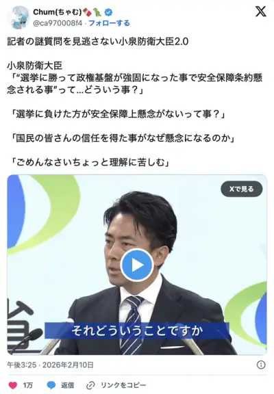 マスゴミ「選挙に大勝して中国様がお怒りなのでは」 小泉防相「負けた方が安全って事?」 ゴミ「あ、いや」