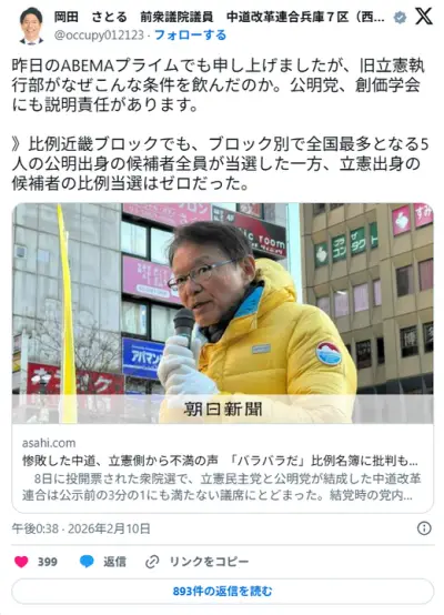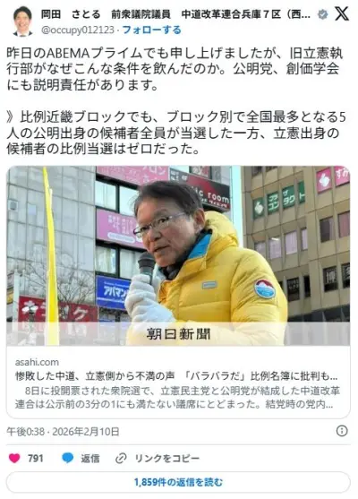 立憲組の落選者、立憲議員を122人墓地に送り公明の議員を4人特殊召喚!に説明責任を要求へ