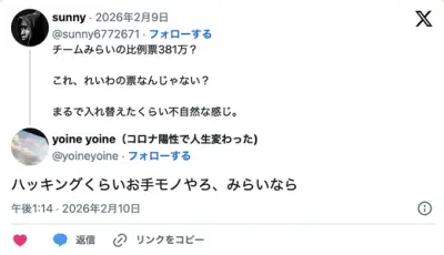 【悲報】れいわ信者「チームみらいはハッキングでれいわの票を奪った」