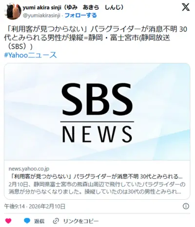 【静岡】「利用客が見つからない」パラグライダーが消息不明 30代とみられる男性が操縦 富士宮市の熊森山周辺