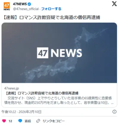 66歳僧侶の男、ロマンス詐欺容疑で逮捕 65歳男性に恋愛感情を抱かせ250万円を騙し取る