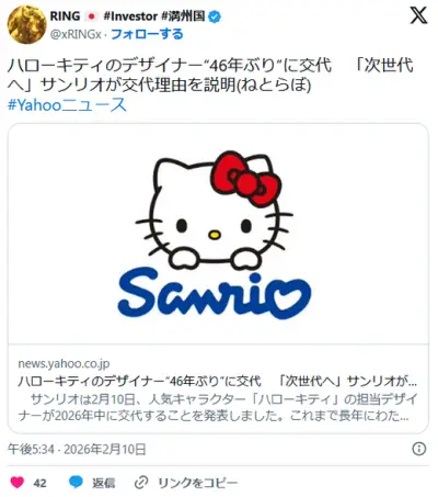 ハローキティのデザイナー“46年ぶり”に交代 「次世代へ」サンリオが交代理由を説明