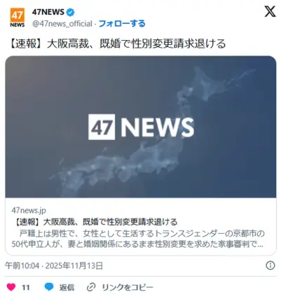 【速報】大阪高裁、既婚で性別変更請求退ける