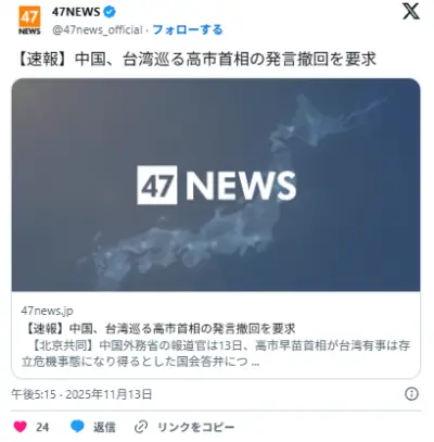 【速報】中国外務省、最後通牒。「高市は直ちに発言を撤回せよ。さもなければ全責任を負う」