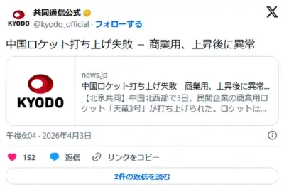 中国ロケット打ち上げ失敗 商業用、上昇後に異常