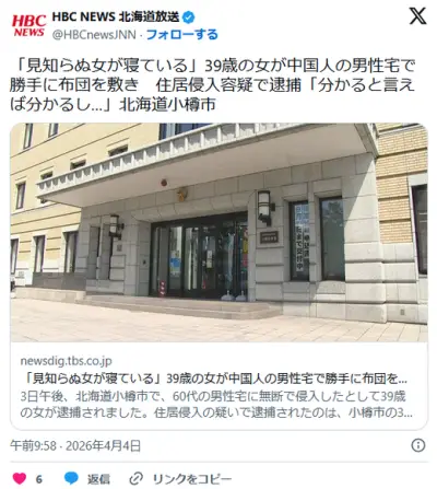 【北海道】「見知らぬ女が寝ている」39歳無職女が中国人男性宅で勝手に布団を敷き 住居侵入容疑で逮捕「分かると言えば分かるし…」小樽