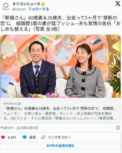 【テレビ】新婚さん 妻・60歳 夫・26歳、出会って5ヶ月 結婚歴3度の妻が猛プッシュで結婚… 夫も覚悟の告白「おしめも替える」