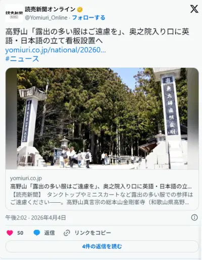 高野山「露出の多い服装の女人の方は修行僧の煩悩をかきたてるが故、お控えください」