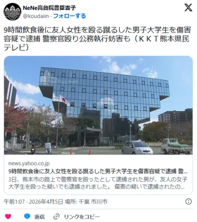 9時間飲食後に友人女性を殴る蹴るした男子大学生を傷害容疑で逮捕 警察官殴り公務執行妨害も