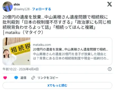 20億円の遺産を放棄…中山美穂さん遺産問題で相続税に批判殺到「日本の税制理不尽すぎる」