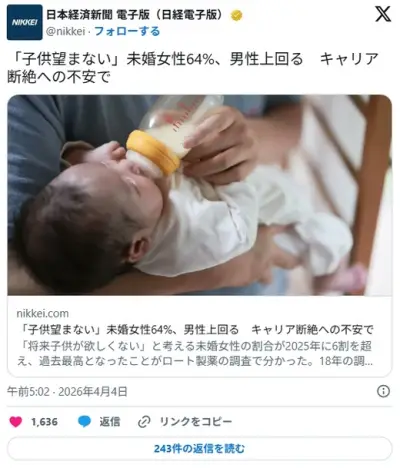 「子供望まない」未婚女性64%、男性上回る キャリア断絶への不安で
