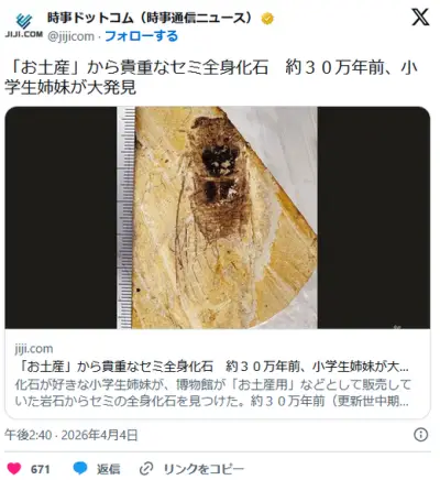 「お土産」から貴重なセミ全身化石 約30万年前、小学生姉妹が大発見