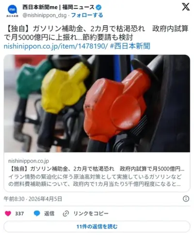 ガソリン補助金、2カ月で枯渇へ… 月5000億円かかるため