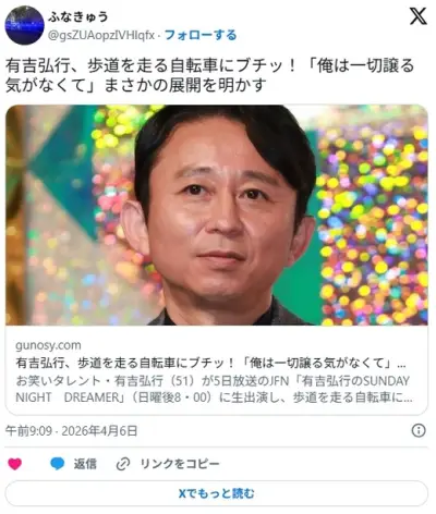 有吉弘行、歩道を走る自転車にイラつく「ベビーカーを押してたら自転車が来て…お互いに動かなかった。俺も一切譲る気ない」
